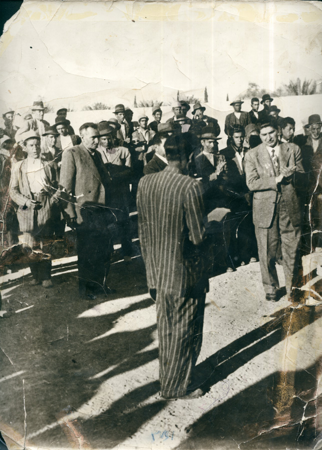 تصویر ) مرحوم شایق (پشت به تصویر و کاغذ به دست) و همچنین مردم محل که احتمال دارد